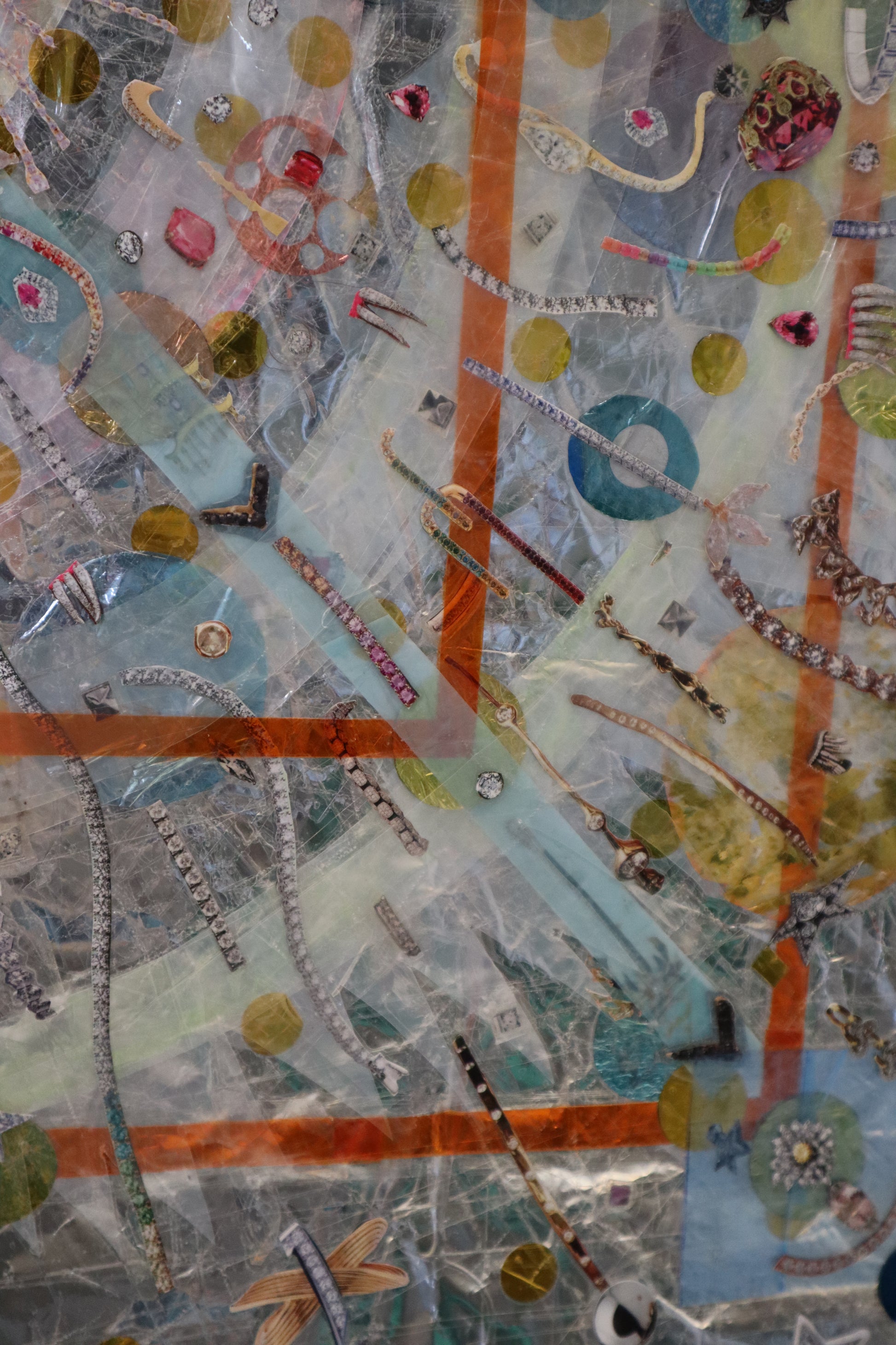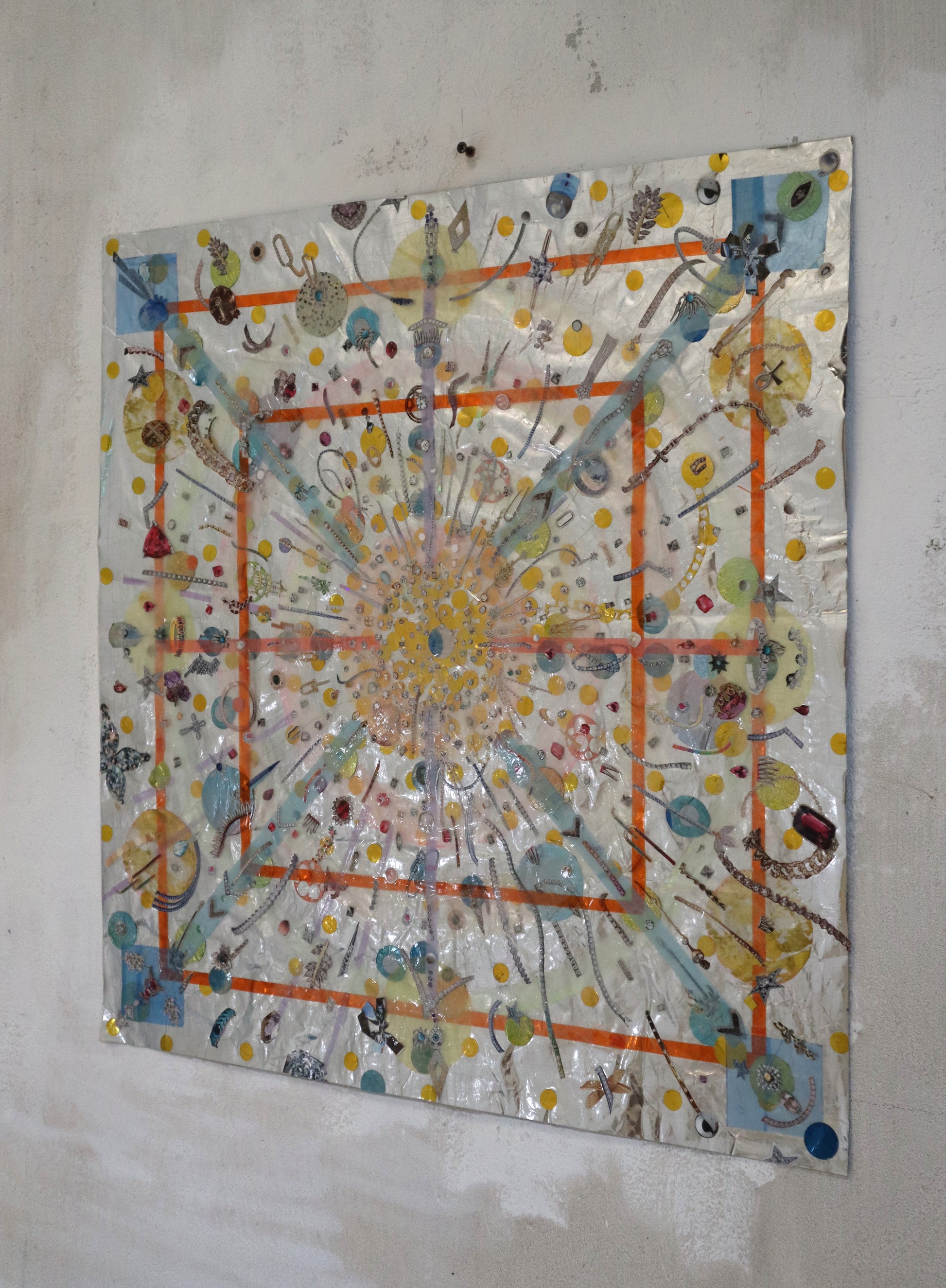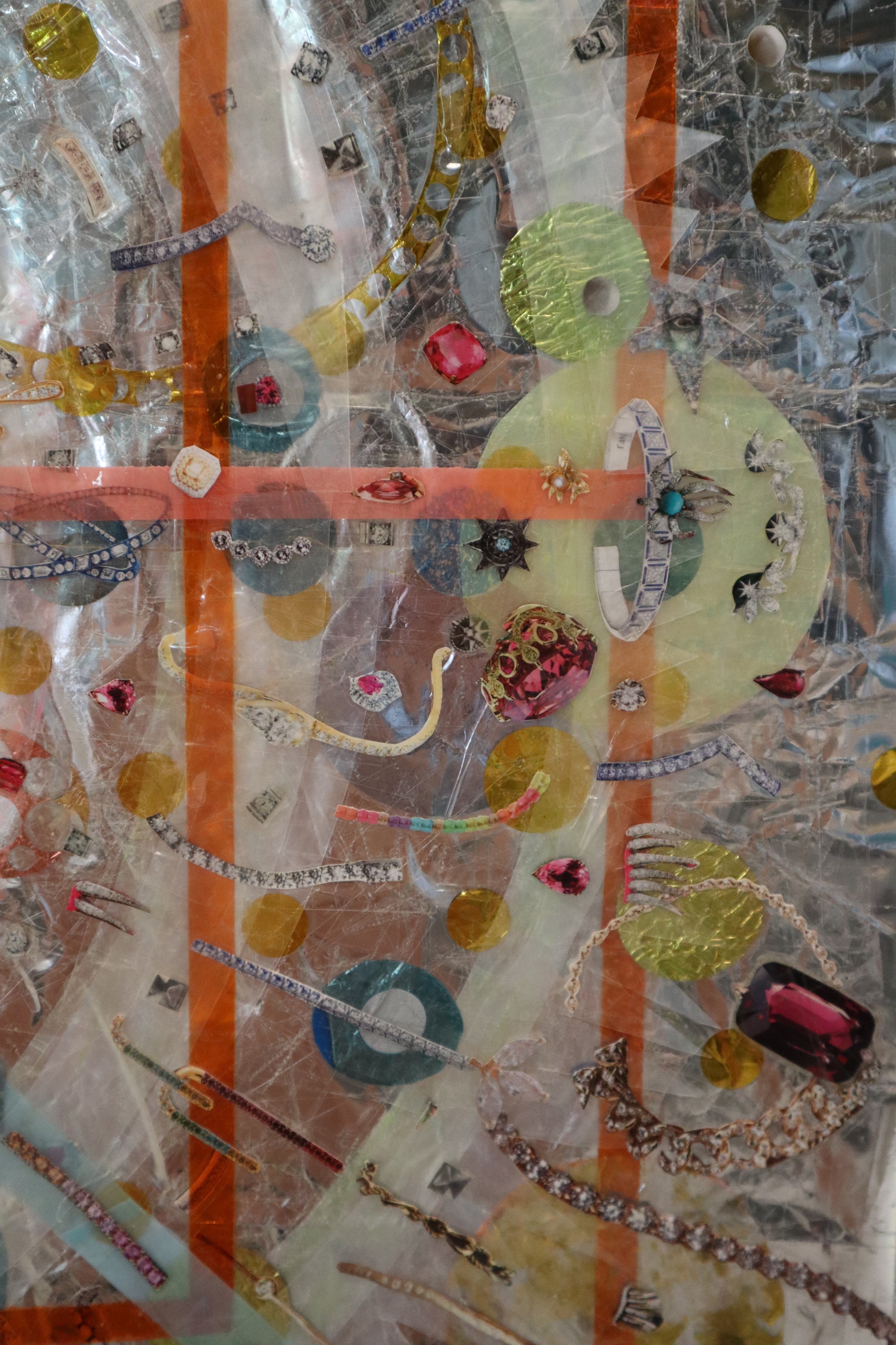 Original collage with plastic packaging, plastic bags, confetti, photo filter film, magazine clippings, scotch tape, on a giant Easter egg wrapper.