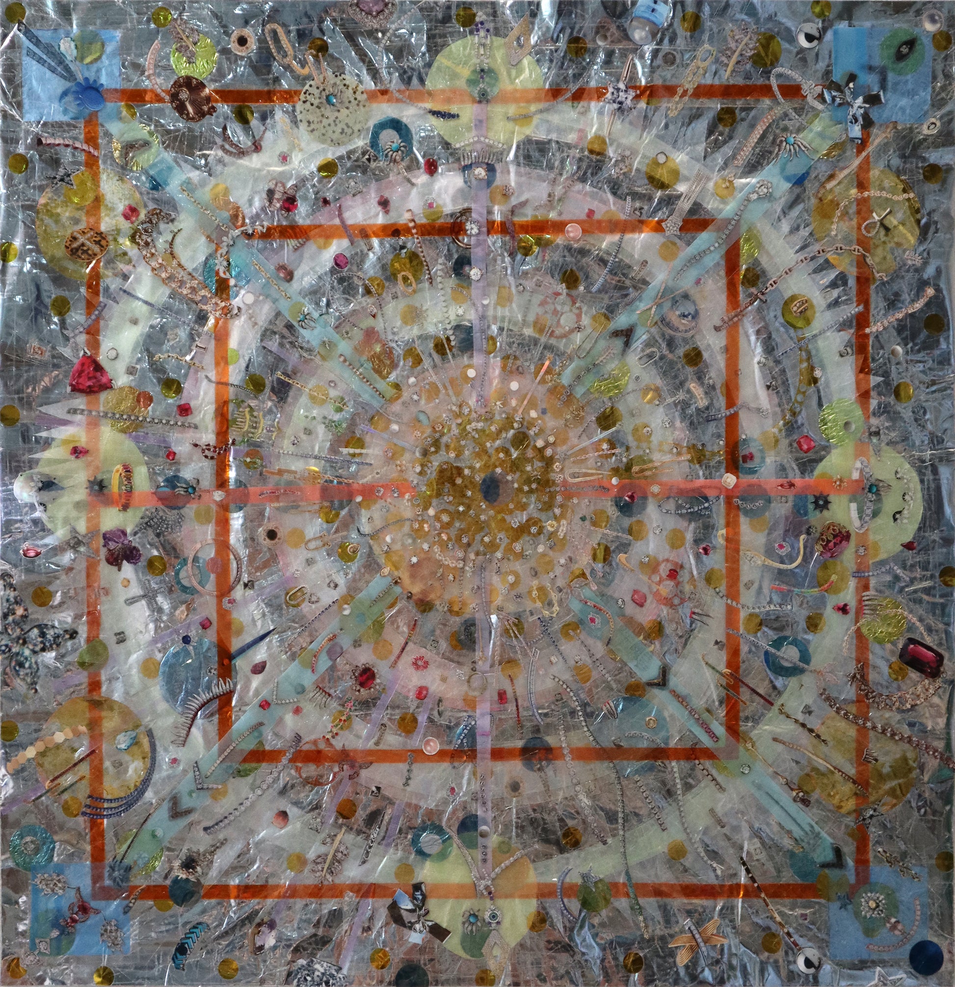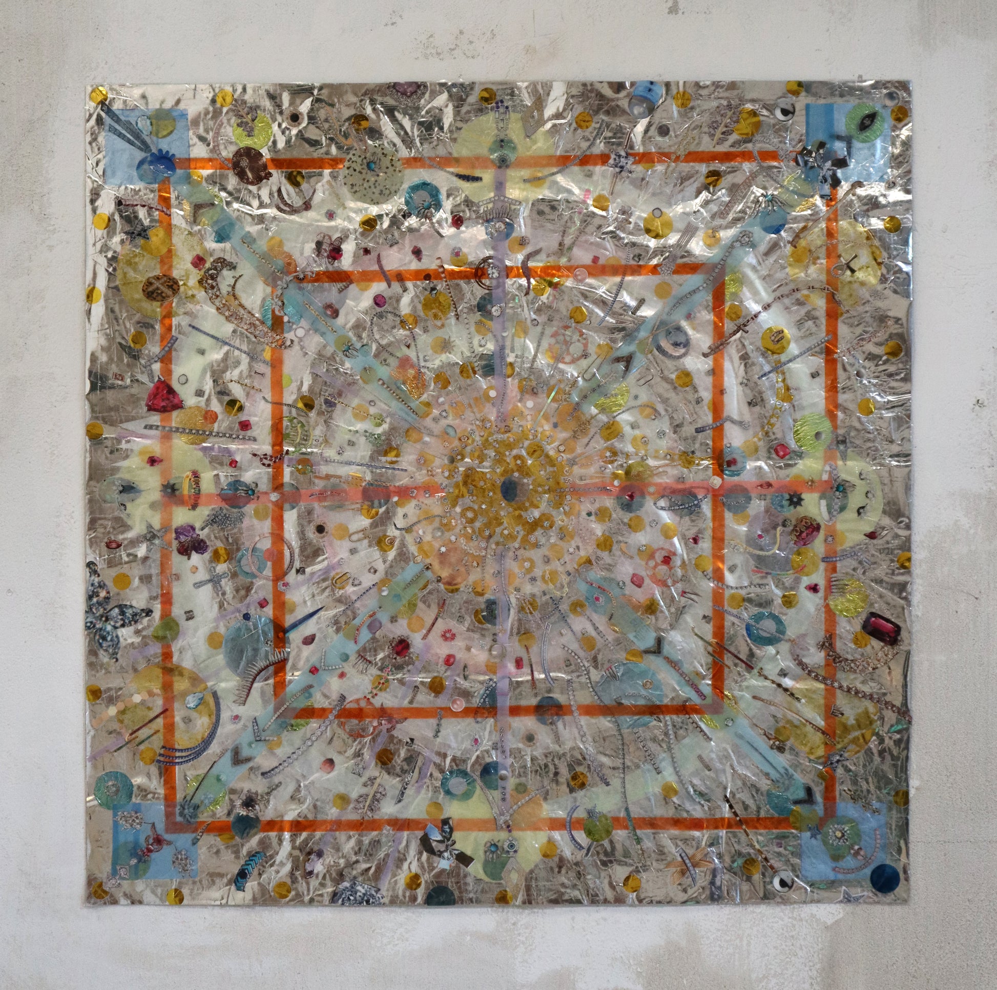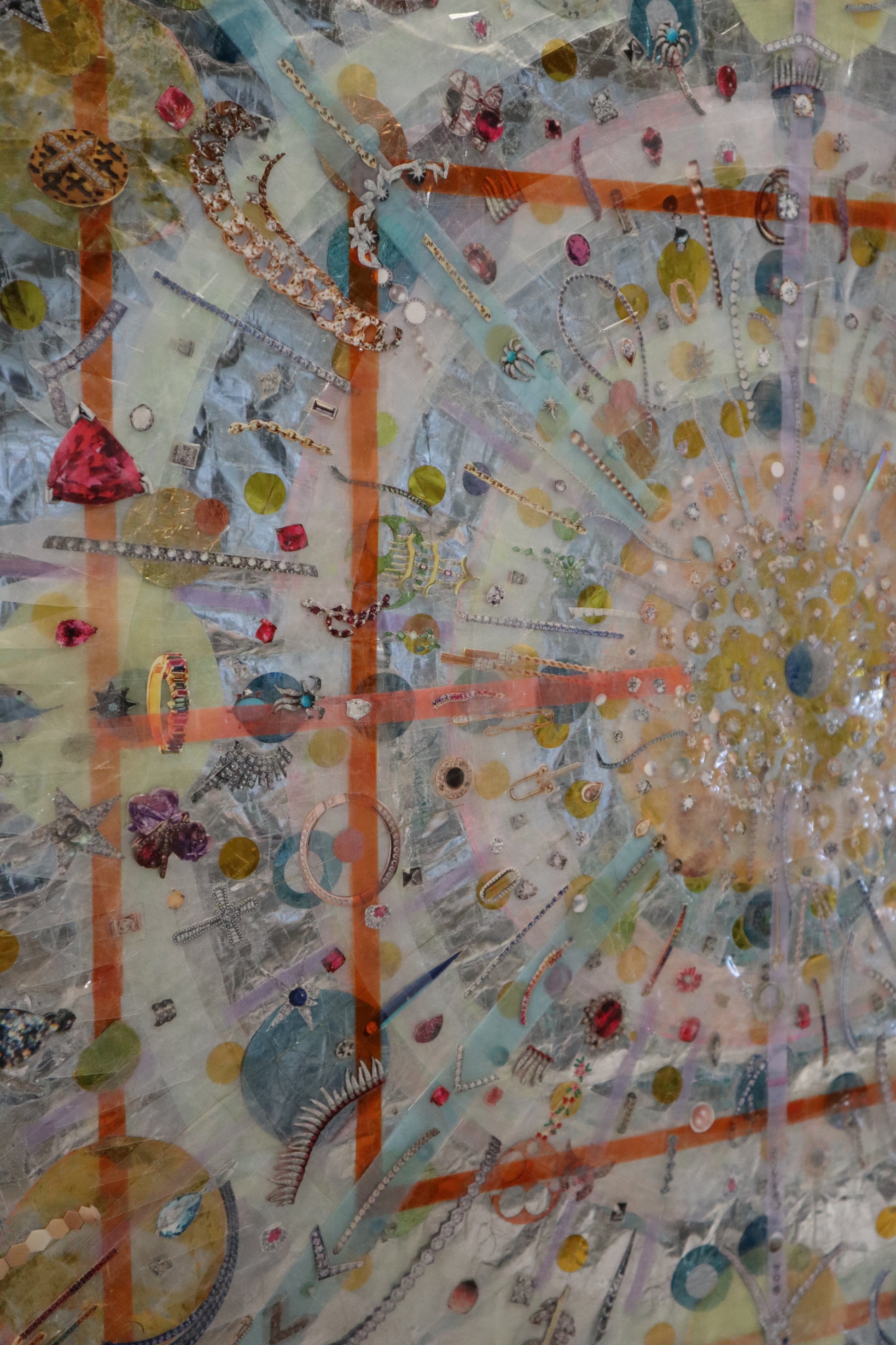 Original collage with plastic packaging, plastic bags, confetti, photo filter film, magazine clippings, scotch tape, on a giant Easter egg wrapper.